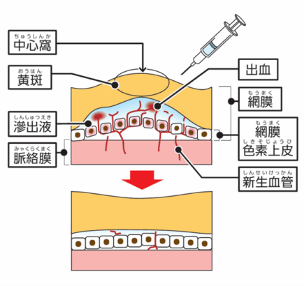 現在の主流治療法です。異常な血管を作る物質(VEGF)を抑える薬を目の中に注射します。